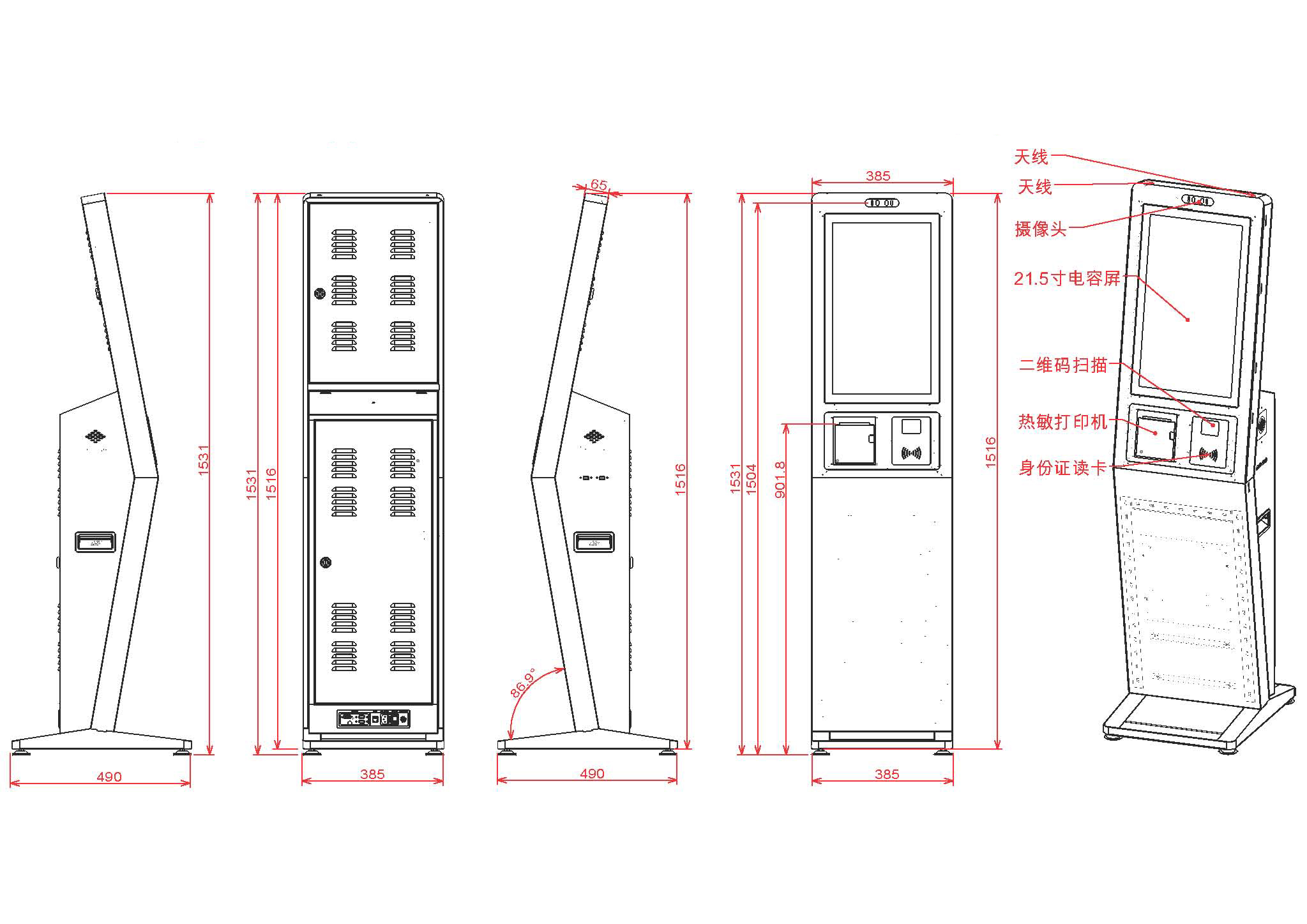 外观为最新设计,整体比较美观时尚,21.5寸竖装显示器。设备支持带二代身份证阅读器、二维码扫描仪,摄像头。正面白色,显示屏框、外设面板与背面为黑色。支持直接将叫号信息通过HDMI线输送到液晶电视上(默认不配置支持)。