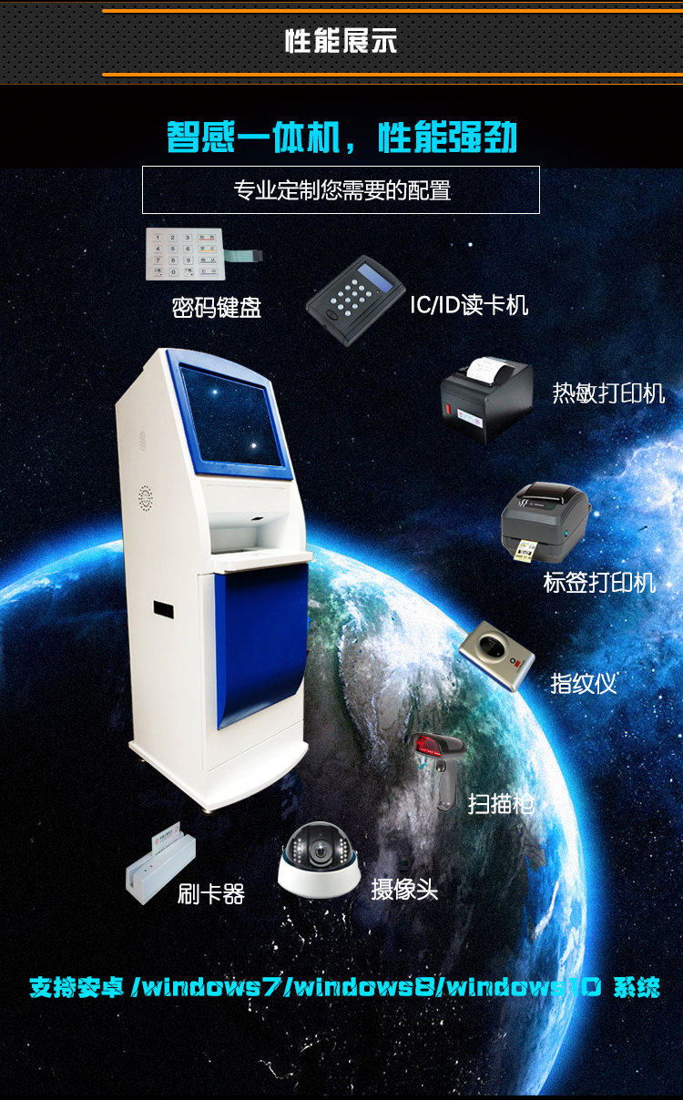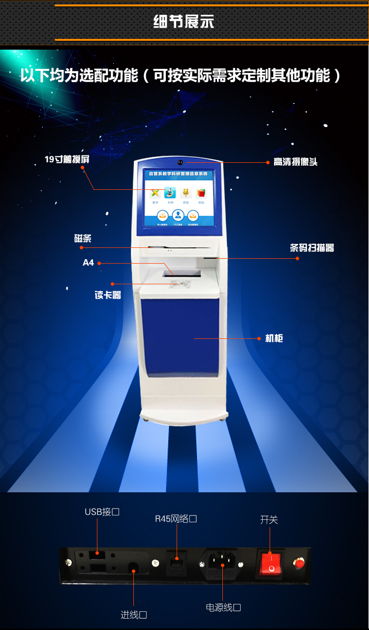 | 其他可选功能 | 1.可选控制电脑配置 2.支持增加小票打印机 3.支持增加激光打印机 4.支持增加身份证阅读器 5.支持增加IC卡读卡器 6.支持添加金属小键盘 7.支持增加二维码扫描仪 8.支持添加前置摄像头 |