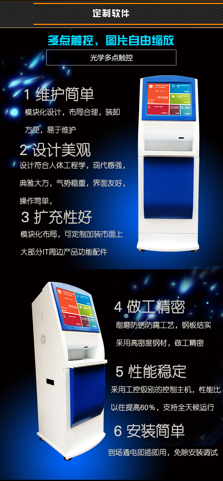 自助服务终端包括: 24小时综合业务自助受理系统及设备,营业厅多媒体信息发布与自助查询系统,营业厅新业务自助体验设备、营业厅排队管理系统,窗口服务评价器、LED 显示屏等系列电子设备和系统软件,已广泛应用于通讯、金融、政府、交通、医疗、工商、税务等行业。
